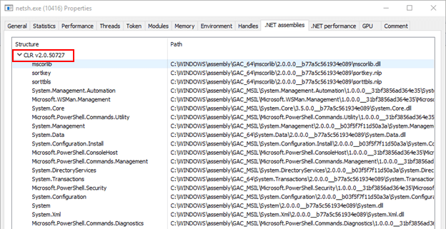 For visibility, it is possible to identify if PoshC2 is running in another process by using Process Explorer which comes as part of the sysinternals suite (https://docs.microsoft.com/en-us/sysinternals/). This allows you to see if any .NET assemblies have been loaded into the running process. If the process is in fact PoshC2, there is a known Indicator of Compromise when running the CLR v4.0.30319 because you will see a DLL loaded called ‘posh’. This does not appear in .NET version two, as shown in the examples below.